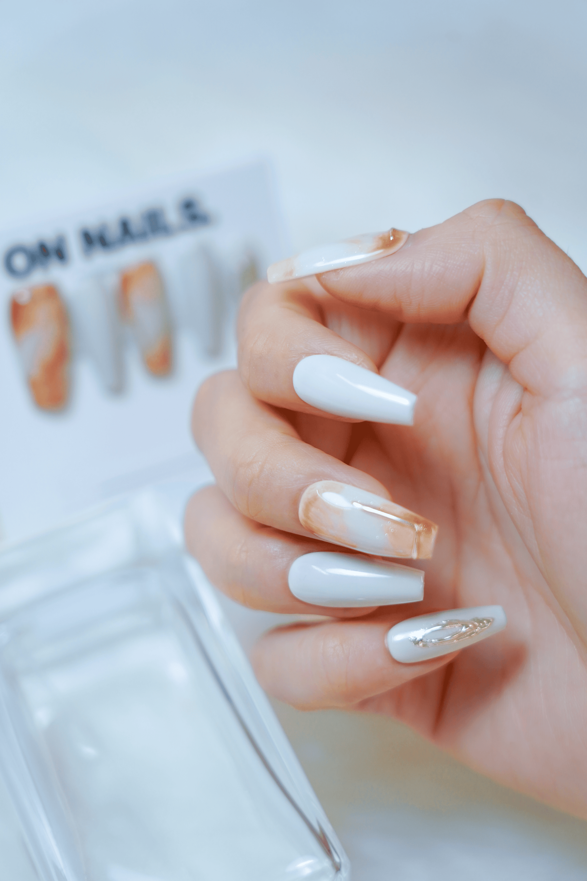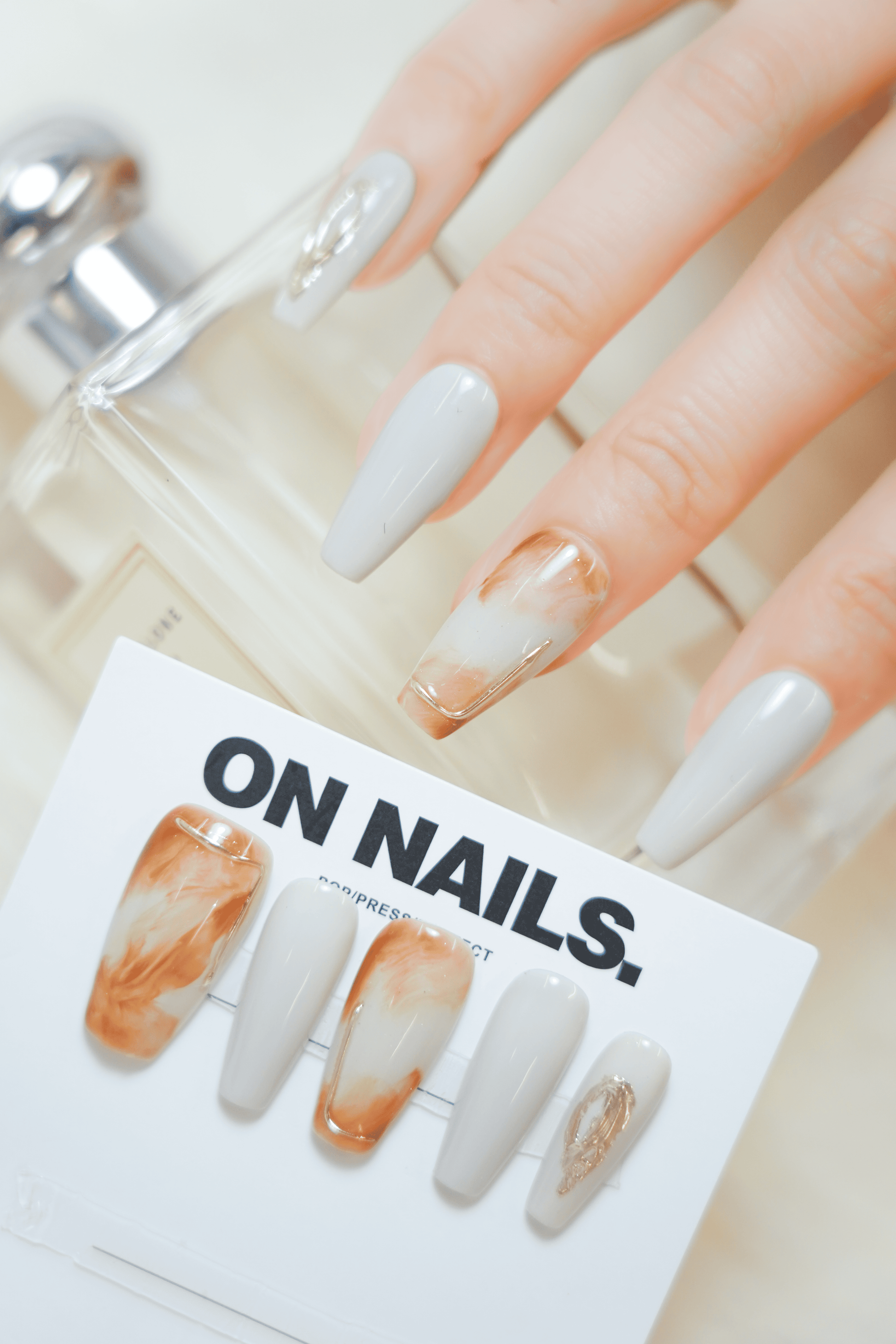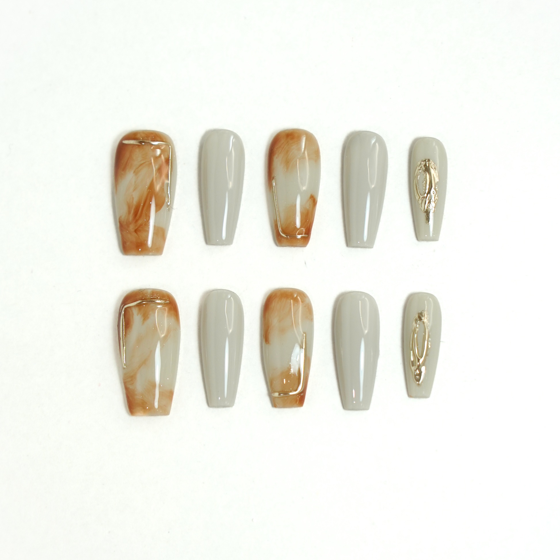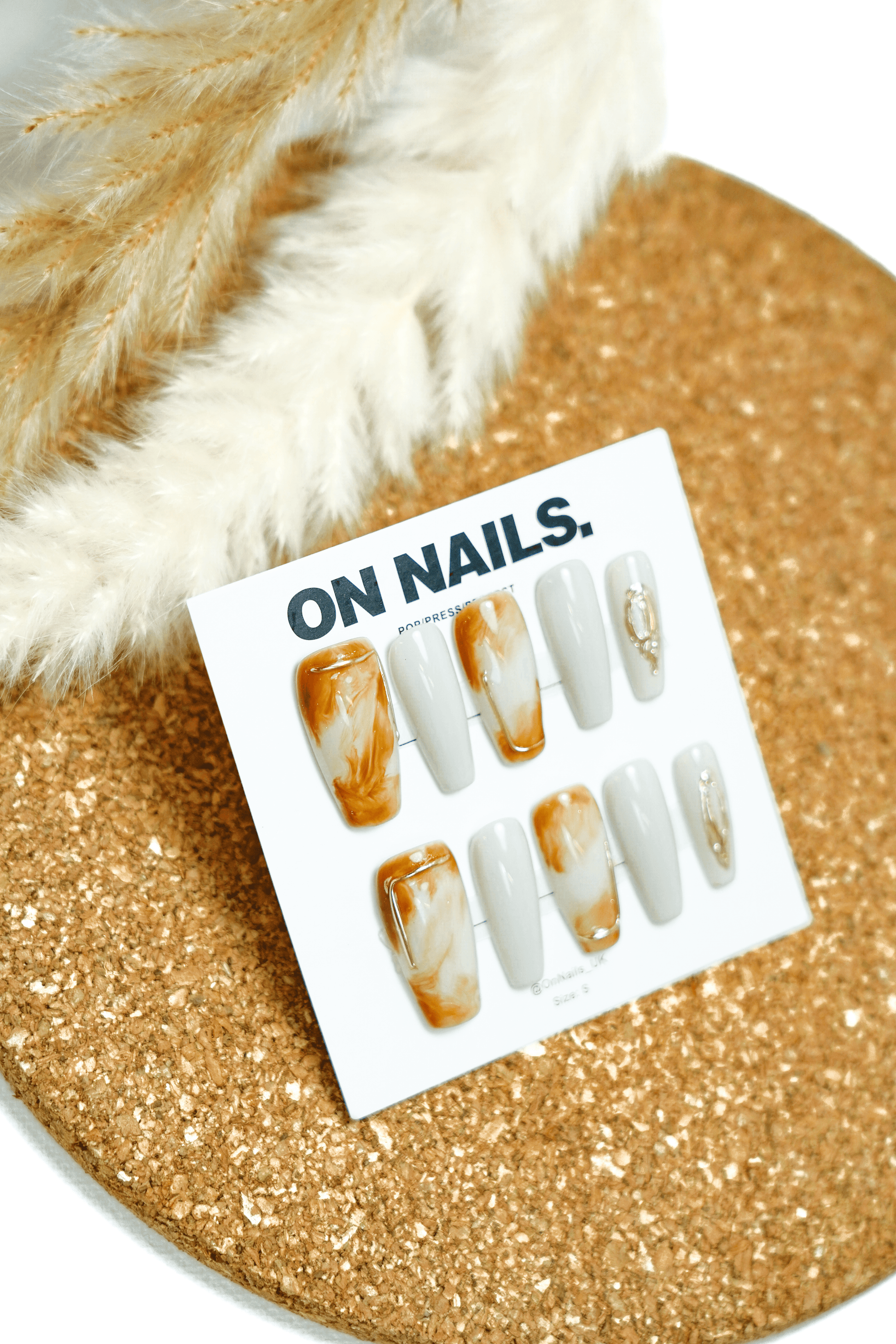 - Swirling Amber Patterns: Each nail showcases a unique amber swirl design, blending warm caramel and cream tones for a rich and luxurious appearance.
