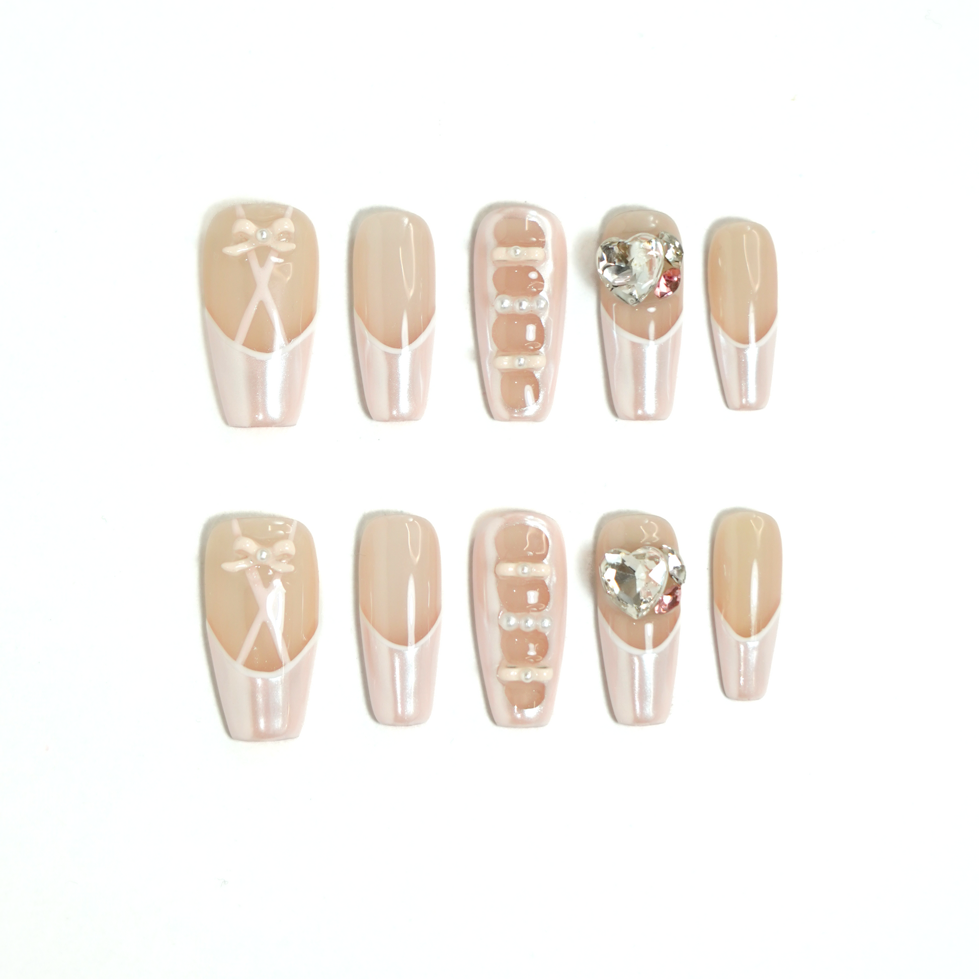 - Delicate Embellishments: The nails are adorned with elegant bows, pearl accents, and a sparkling gem, adding a touch of luxury and sophistication.