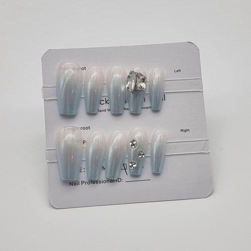 Embrace the cool elegance of winter with our "Blue Winter" press-on nails. These stunning nails capture the serene beauty of wintertime, featuring a delicate gradient of icy blue tones accented with sparkling rhinestones.
