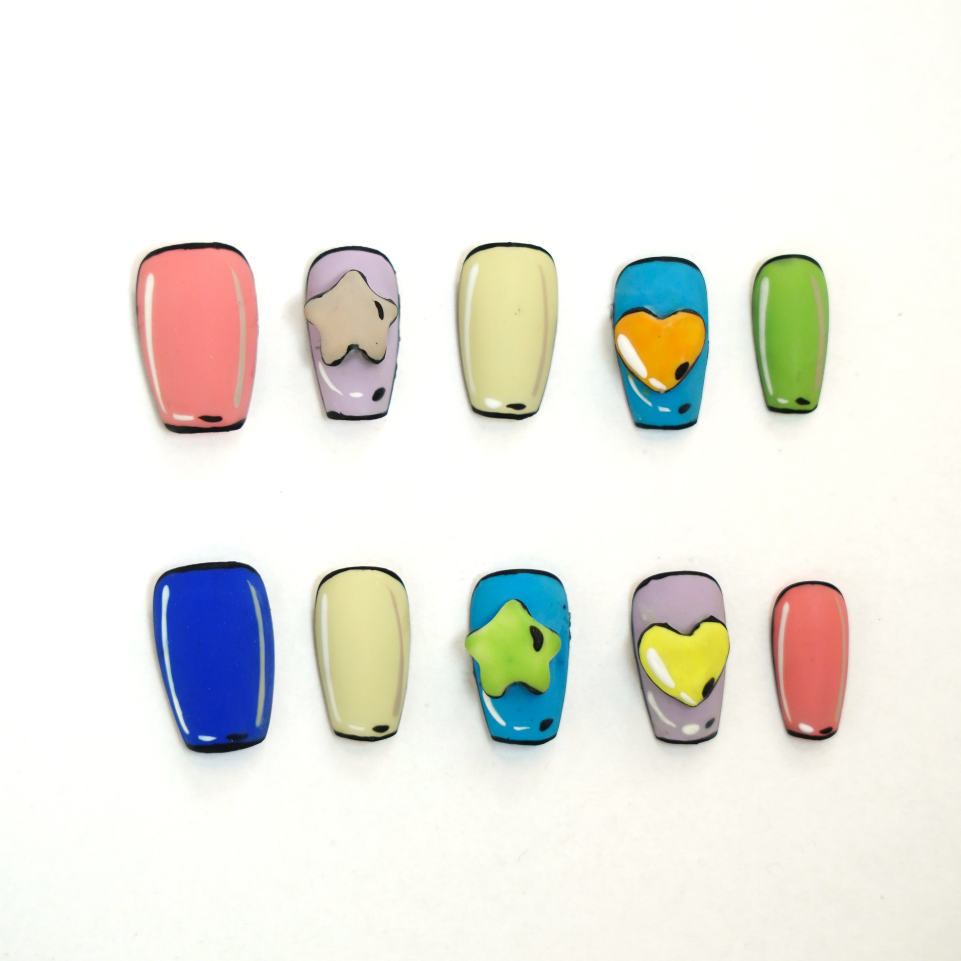 - 3D Accents: The set includes nails with playful 3D heart and star embellishments, adding a touch of whimsy and dimension to the design.