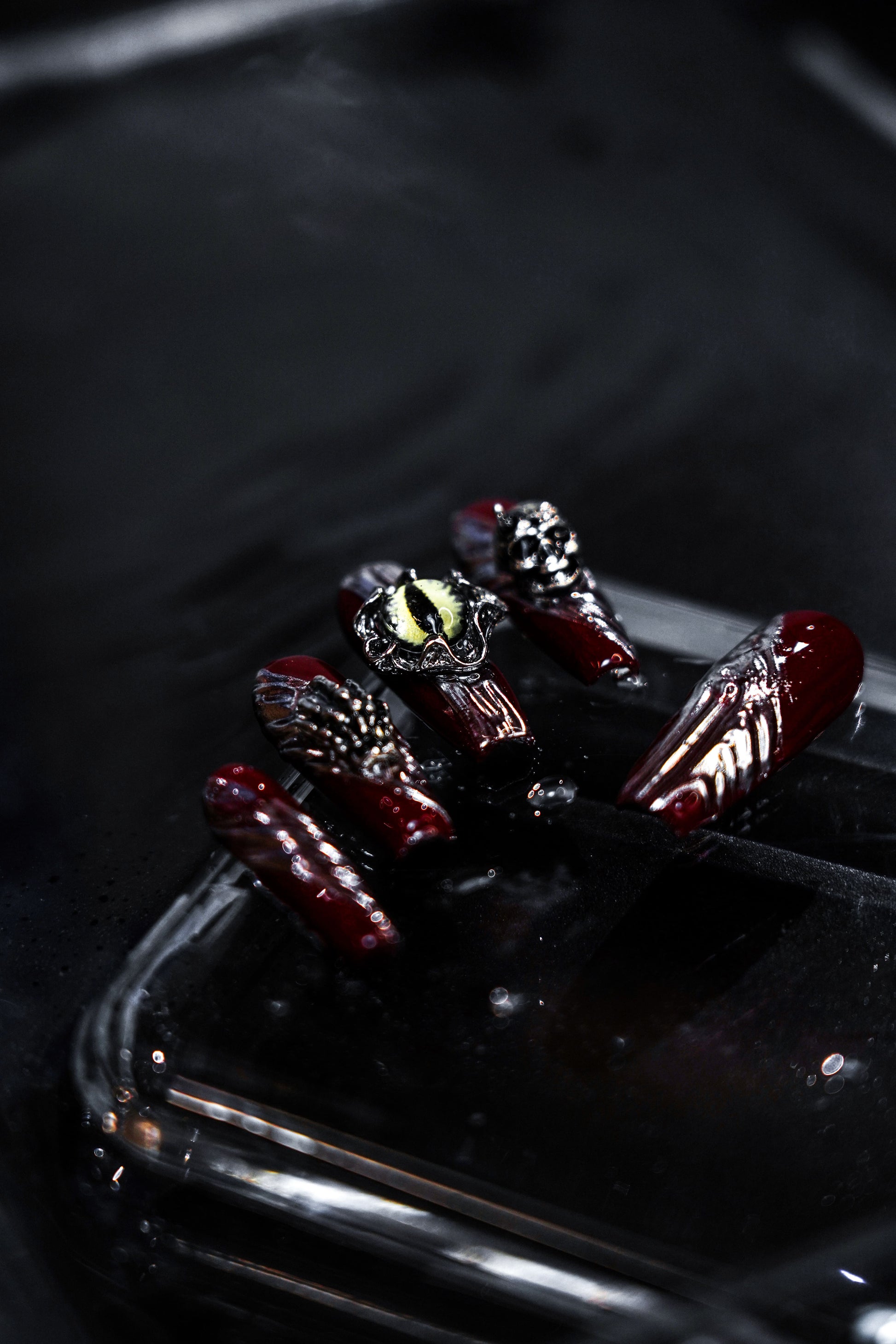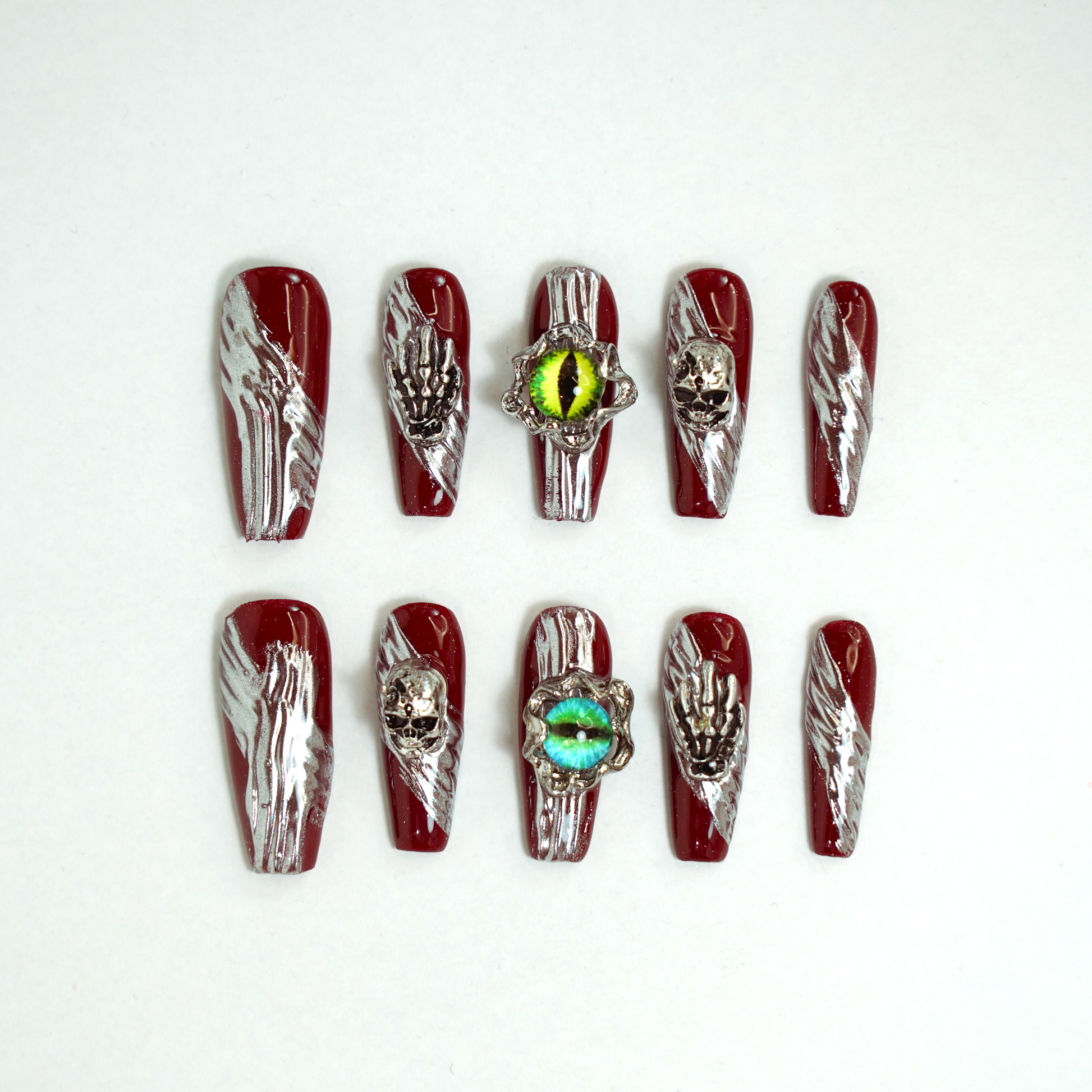 - Intricate Embellishments: The set includes nails adorned with skulls, skeletal hands, and piercing, reptilian eye charms, adding a menacing yet captivating touch.