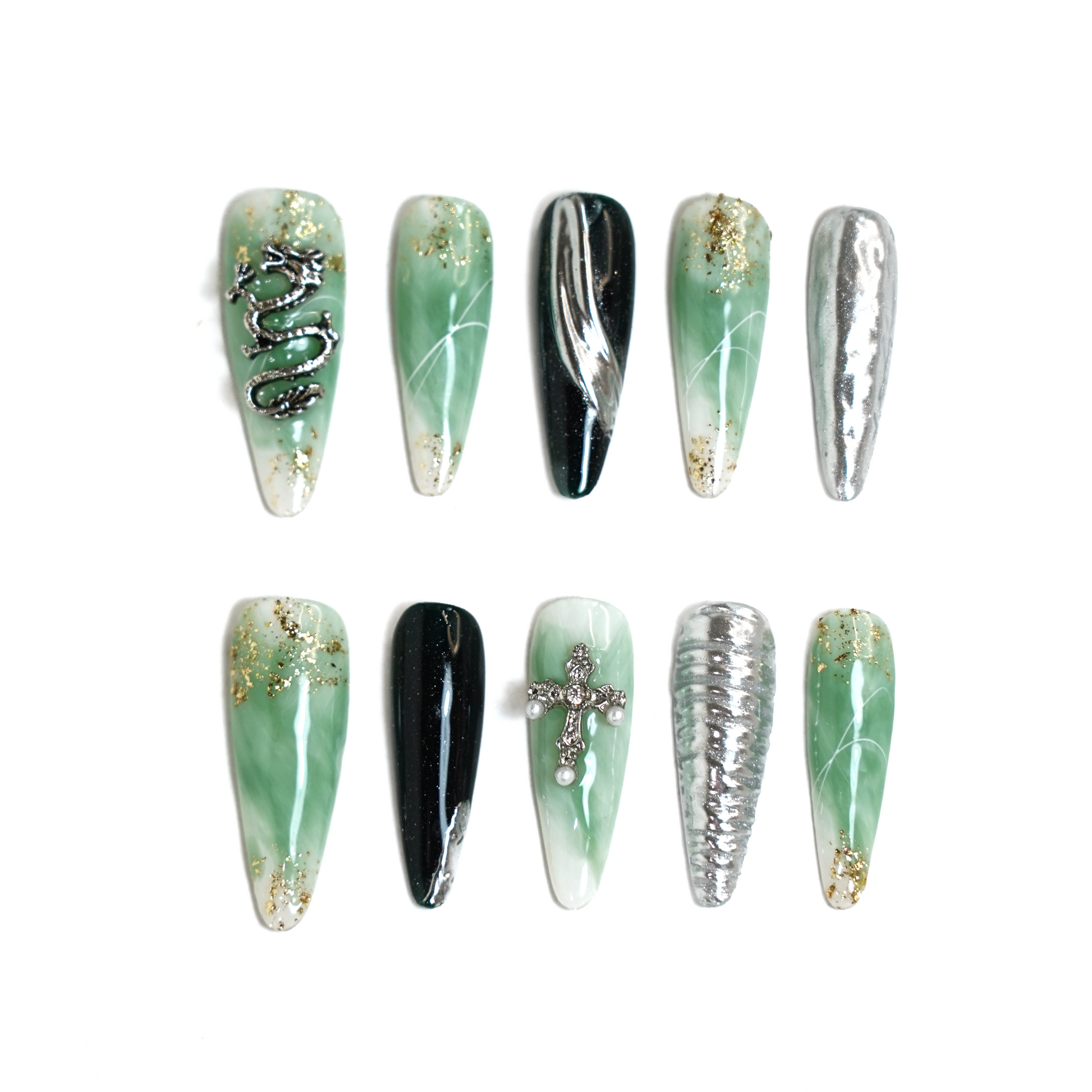 - Dragon and Cross Embellishments: The set includes nails adorned with intricate dragon and cross motifs, adding a layer of mystique and spiritual symbolism.