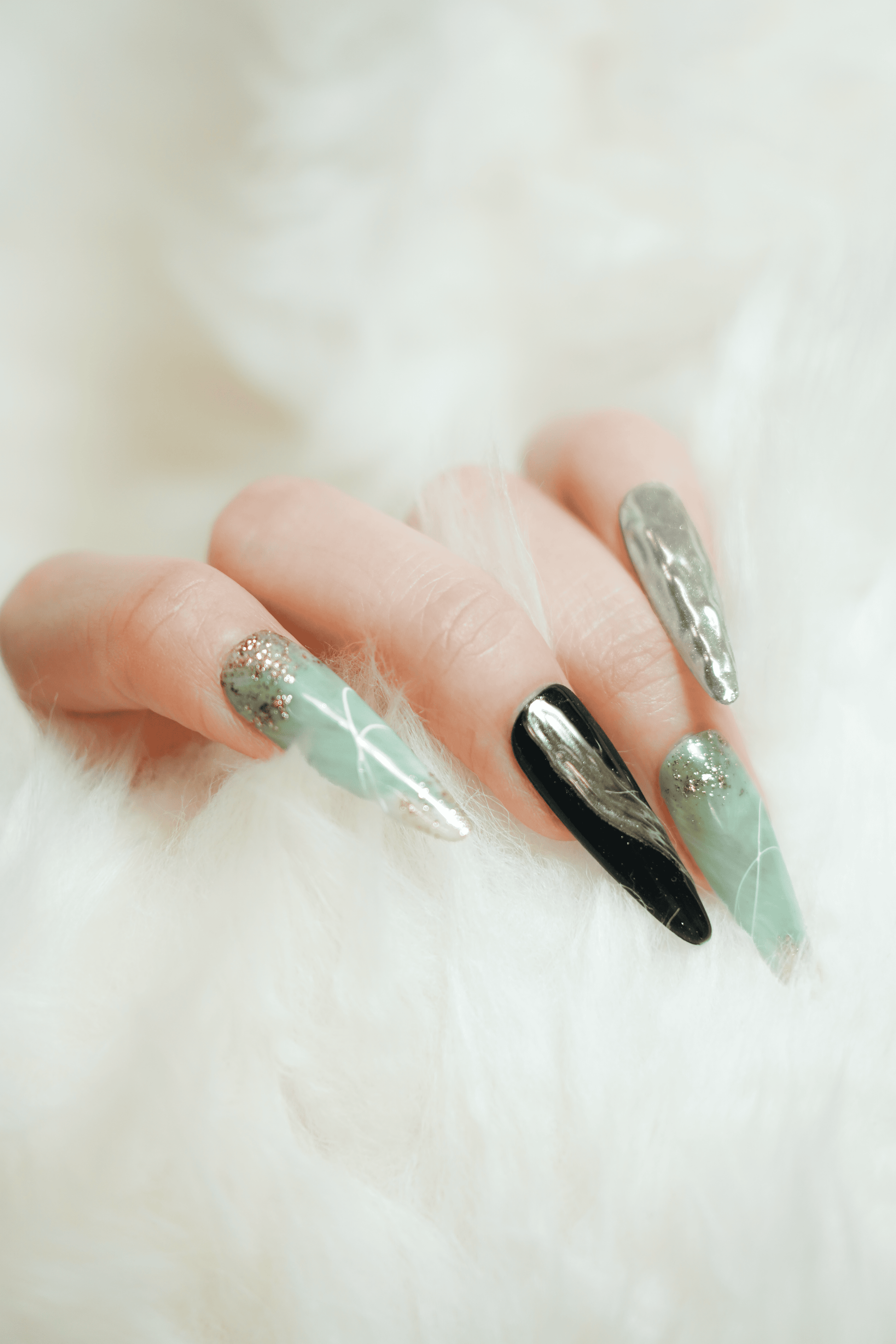 - Metallic Accents: The nails are enhanced with silver and gold details, adding a touch of luxury and making the design even more striking.