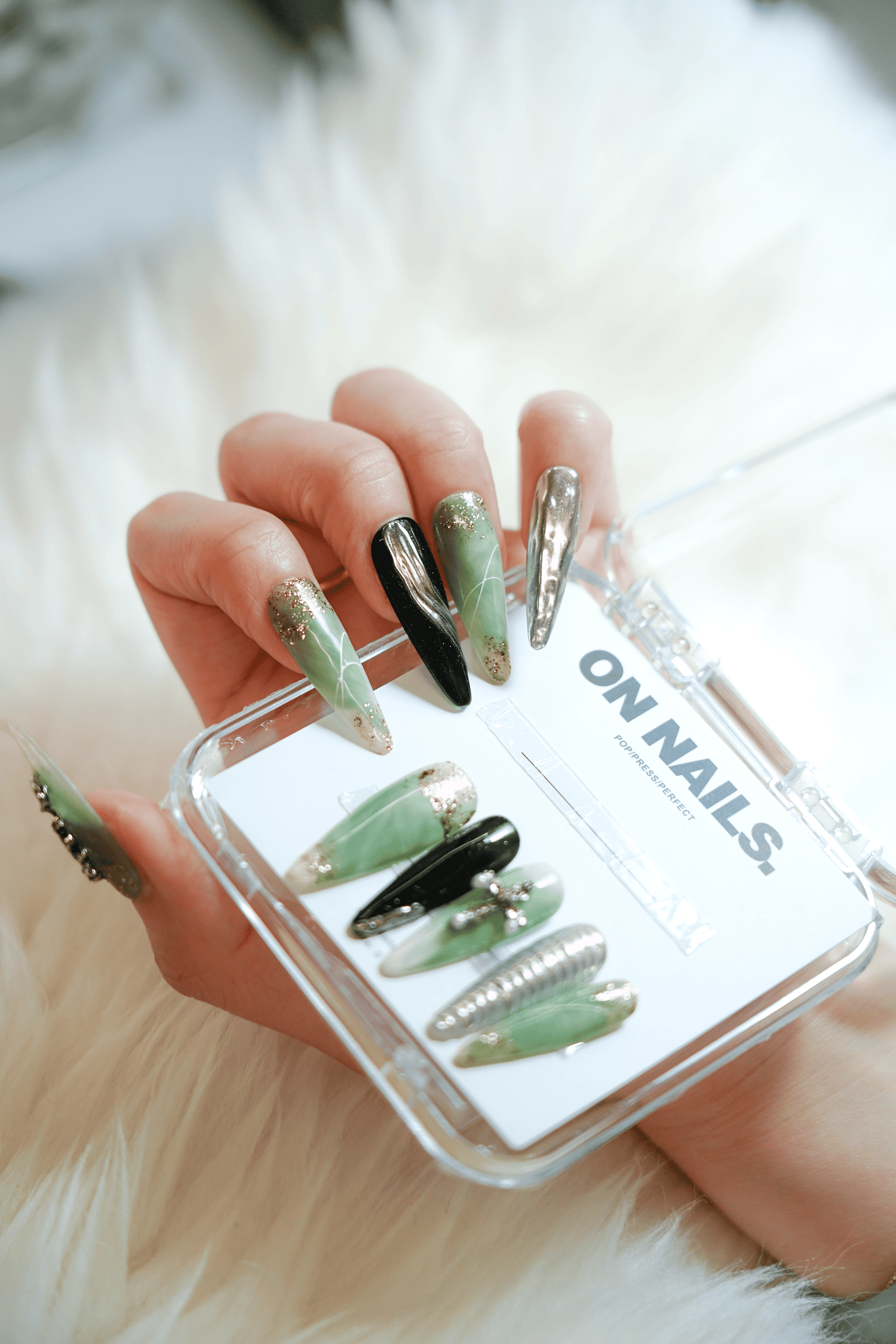 - Jade-Inspired Beauty: Each nail showcases a stunning jade green base with swirling patterns, reminiscent of precious jade stone, symbolizing power and serenity.