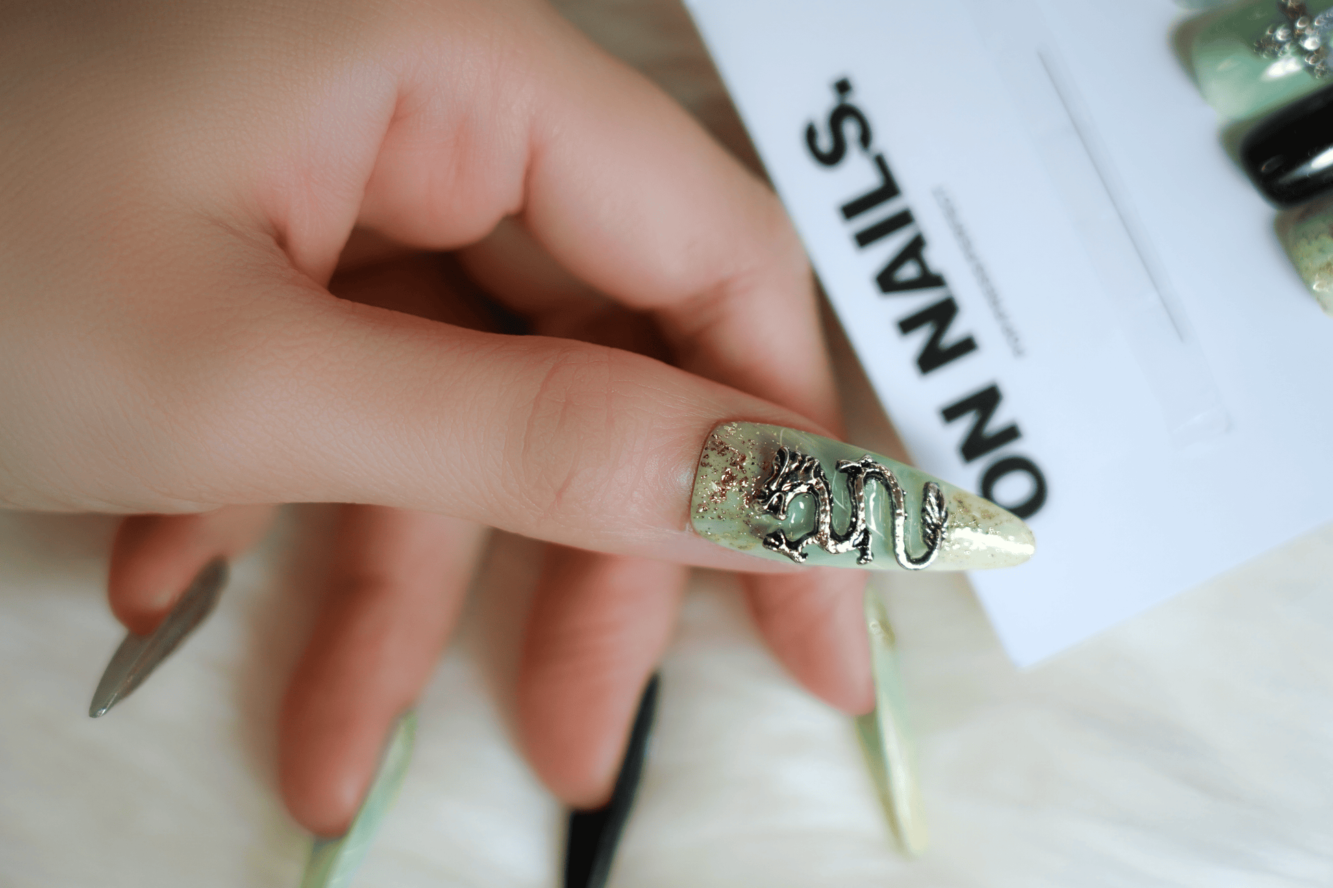Embrace the ancient power and elegance of "Jade Loong" with these striking press-on nails. Perfect for those who appreciate bold, symbolic designs, these nails will elevate any outfit with their mystical charm and luxurious details.