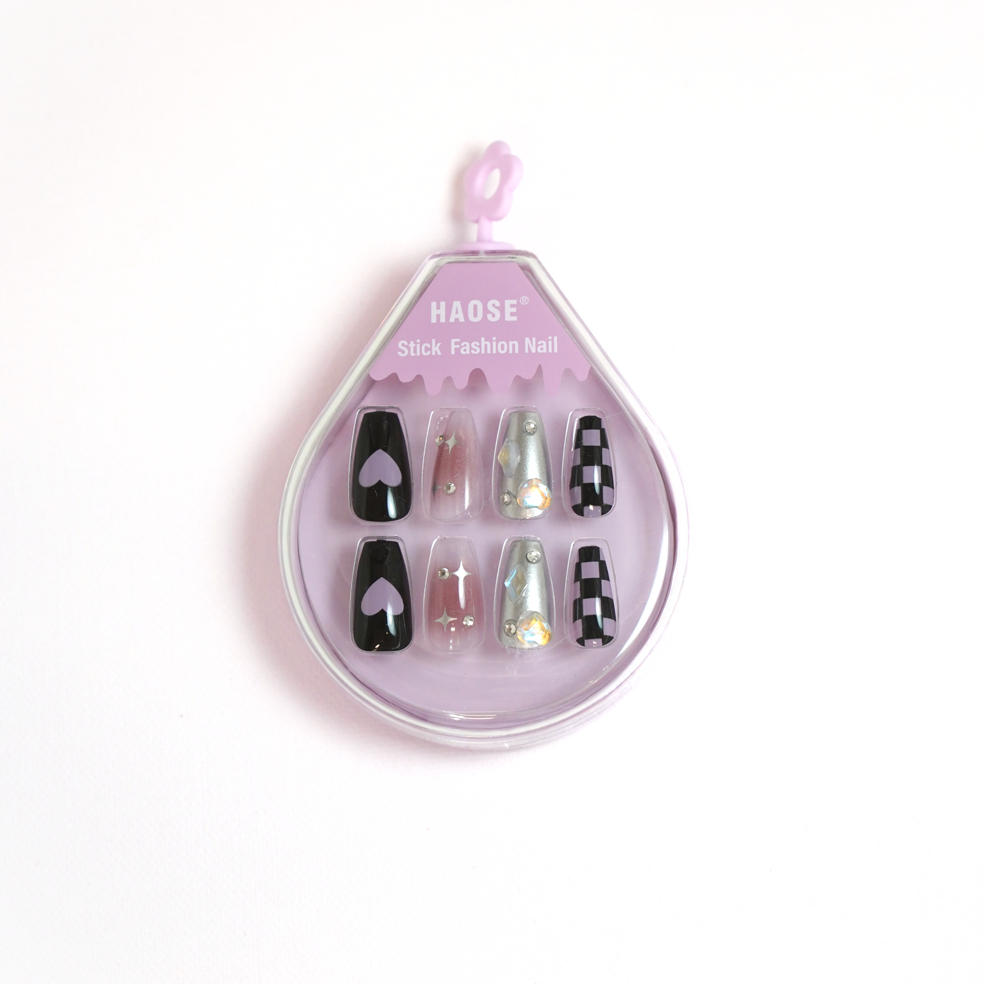 - Charming Patterns: Each nail showcases a unique design, including hearts, checkerboards, and geometric patterns in a harmonious blend of black, pink, and lilac tones.