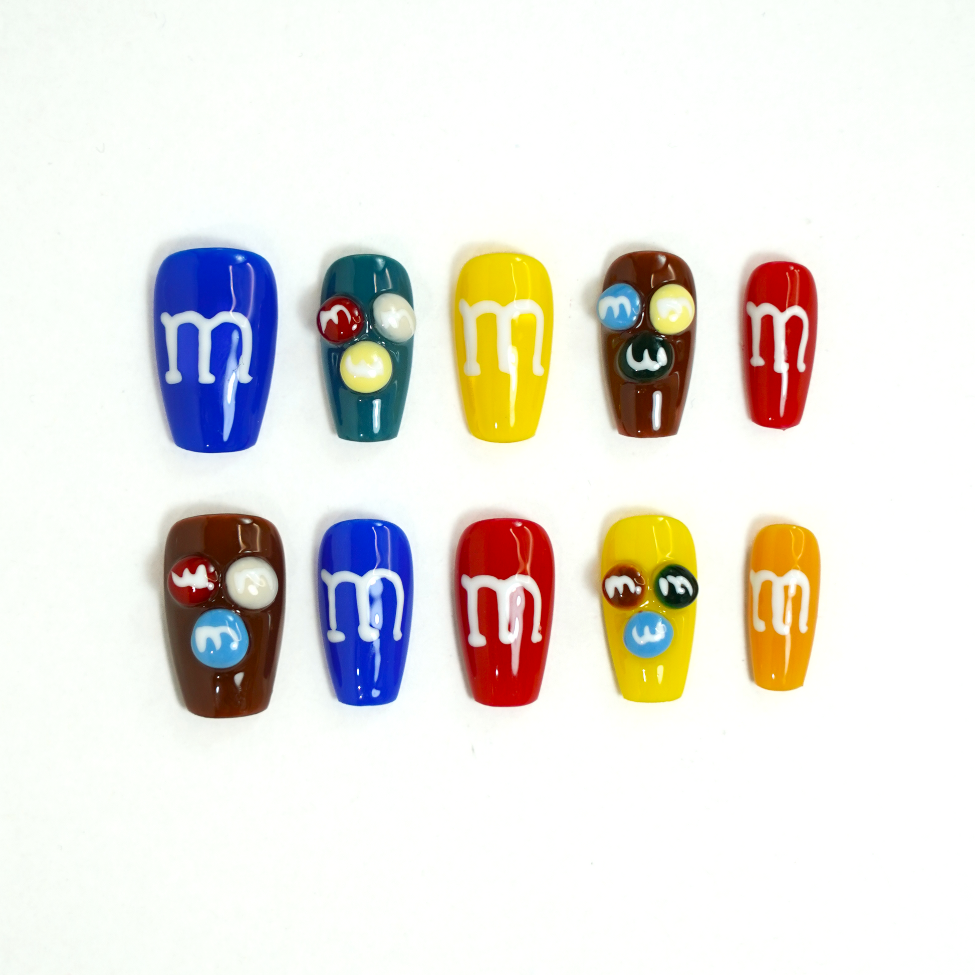 - Candy Colors: Each nail features a bright and bold color reminiscent of classic M&M’s, including blue, yellow, red, brown, and orange.