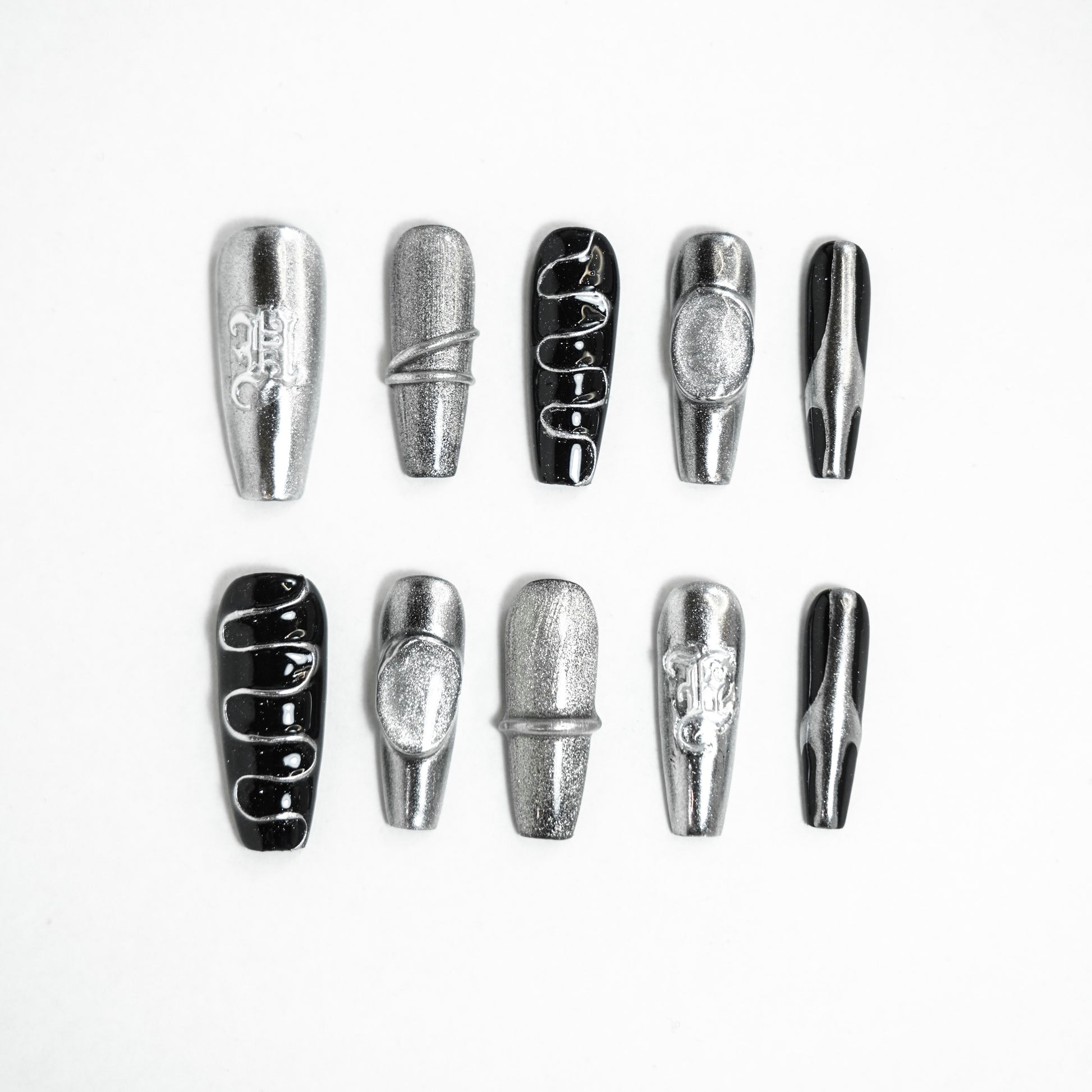 Step into the future of fashion with our "Metallic Glamour" press-on nails. These nails feature a striking combination of shimmering silver and bold black, perfect for adding a touch of high-octane glamour to your look.