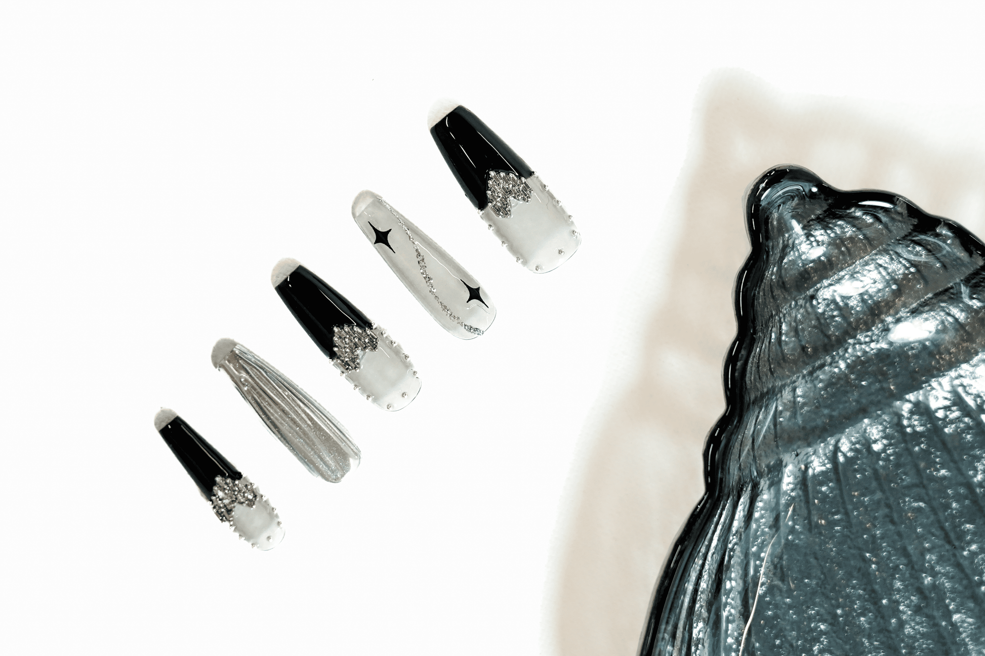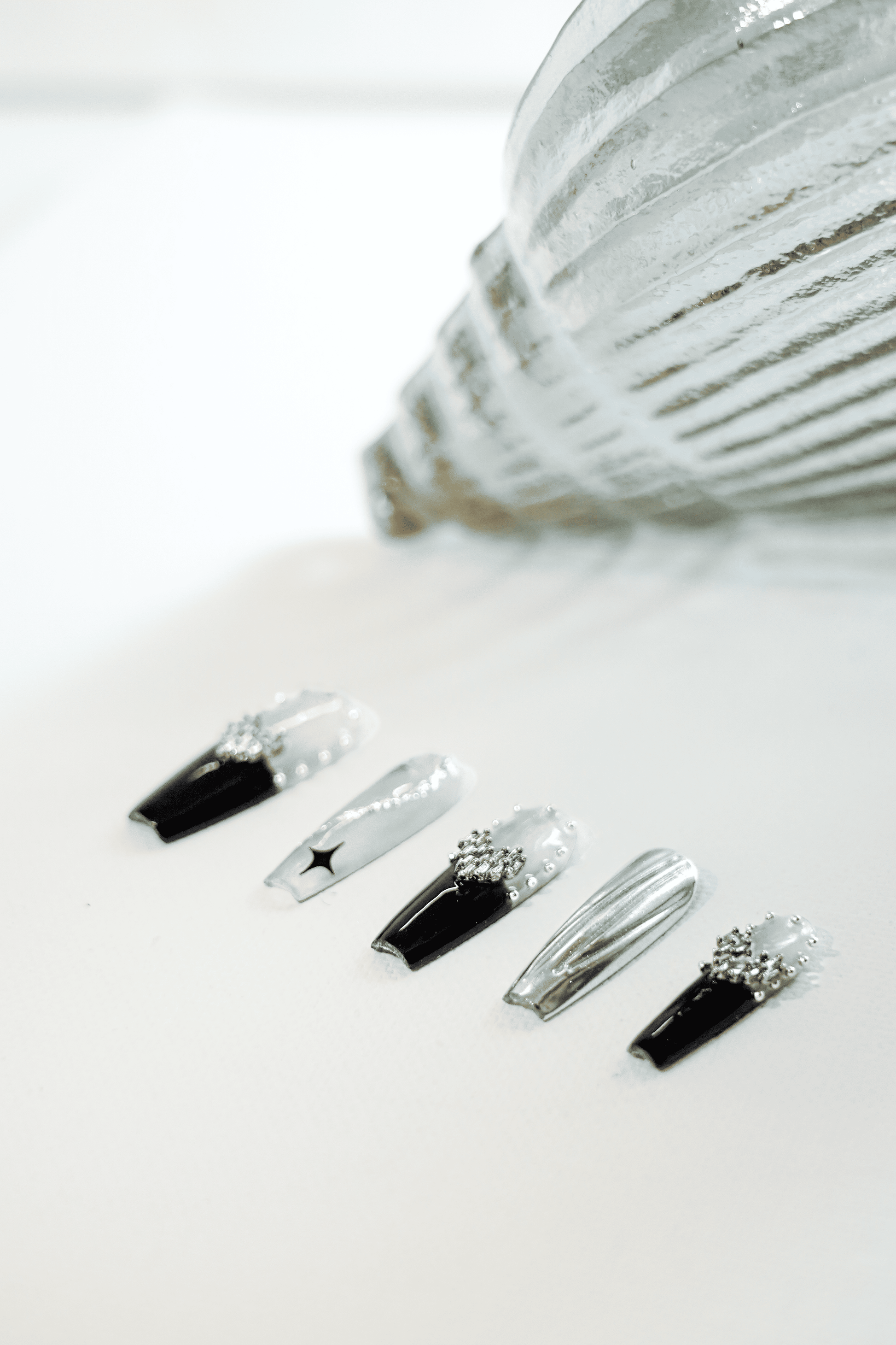 Embrace the elegance of the night with our "Noir Starry Night" press-on nails. These nails feature a sophisticated black and silver design inspired by the beauty of a starry night sky, perfect for adding a touch of mystery and glamour to your look.