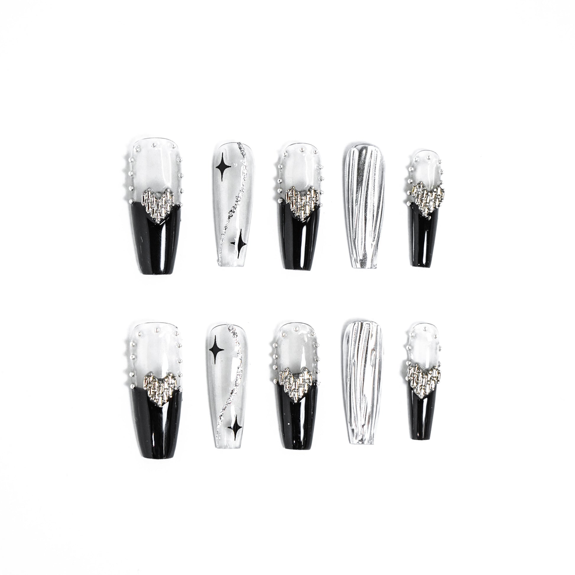 - Elegant Black and Silver Palette: Each nail showcases a sleek combination of deep black and shimmering silver, creating a striking contrast reminiscent of a starry night.