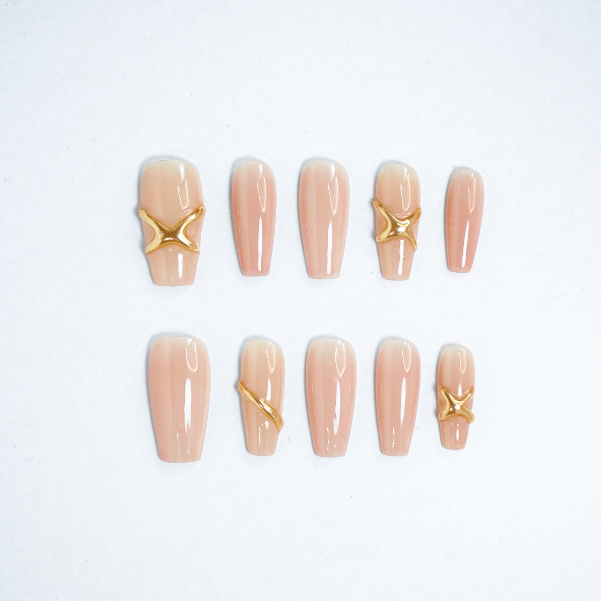 Discover timeless sophistication with our "Nude Elegant" press-on nails. These nails feature a classic nude design with luxurious gold accents, perfect for adding a touch of understated elegance to your look.