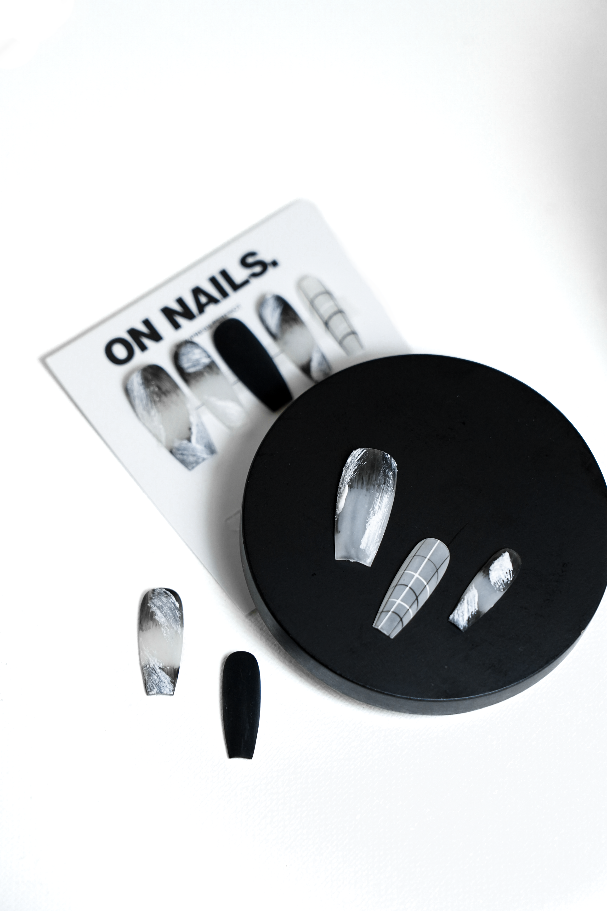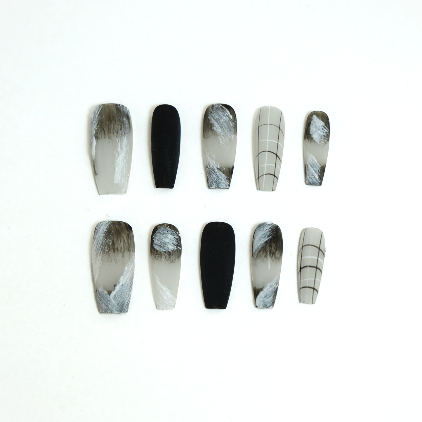 Step into a world of modern art with our "Obsidian Plaster" press-on nails. These nails feature a striking blend of monochrome tones and abstract patterns, perfect for adding a touch of edgy sophistication to your look.