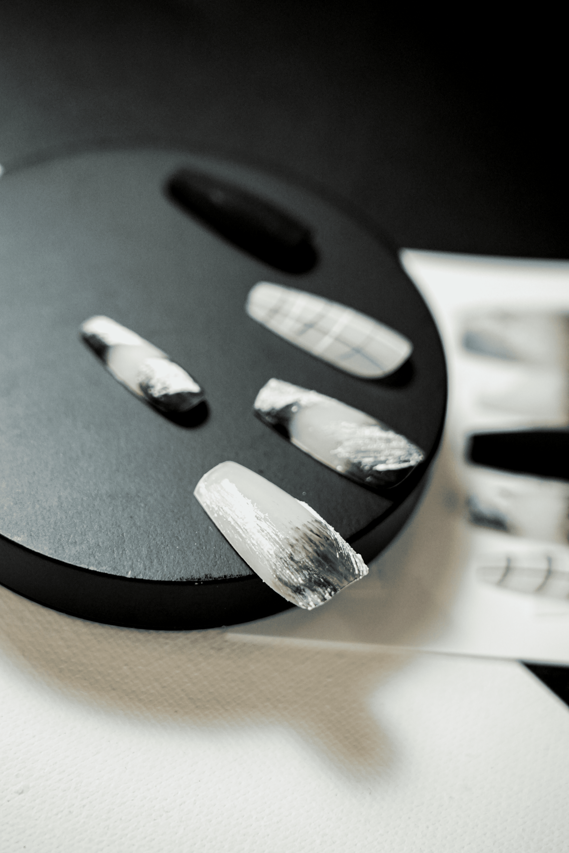- Monochrome Palette: Each nail showcases a sleek combination of black, grey, and white tones, creating a bold and contemporary look.