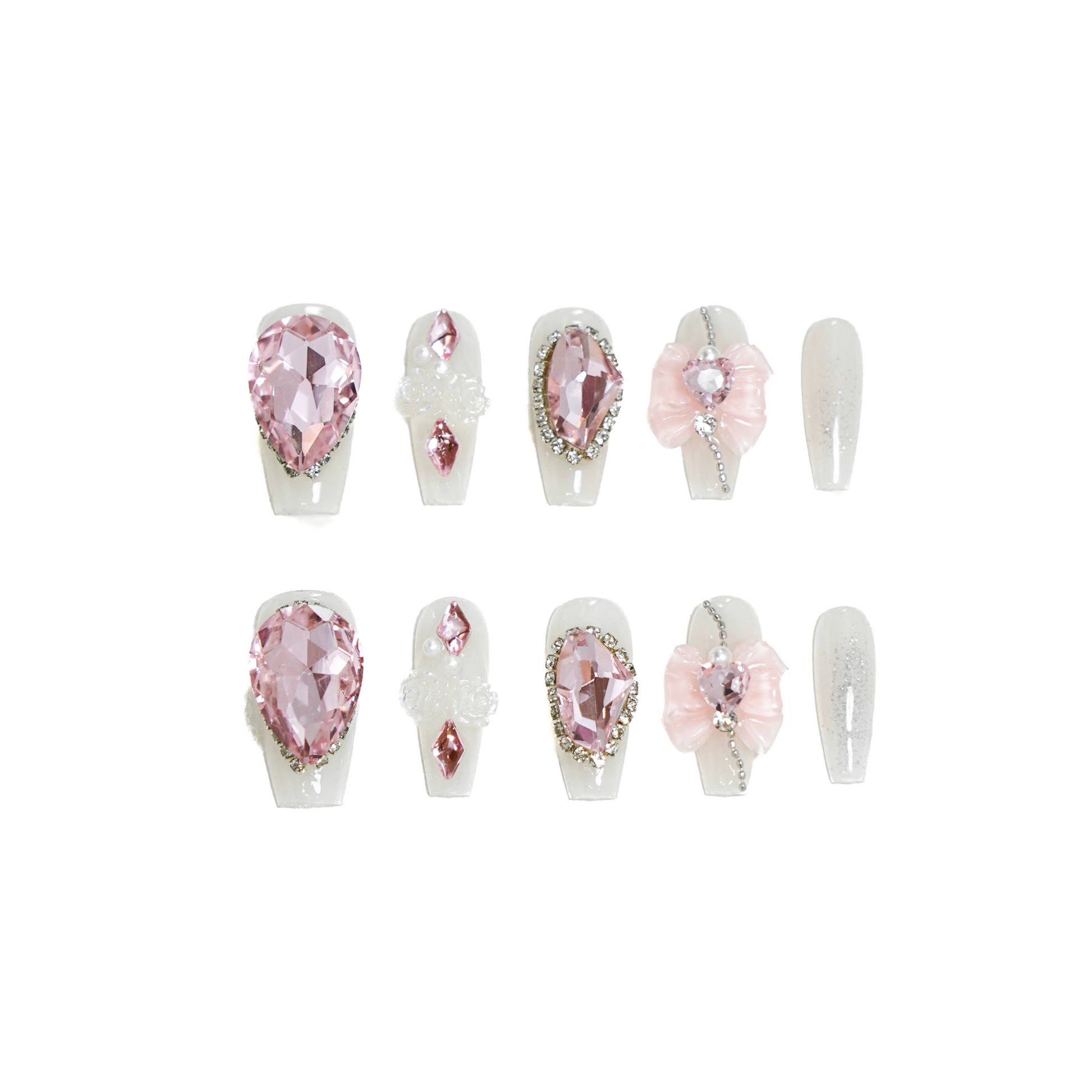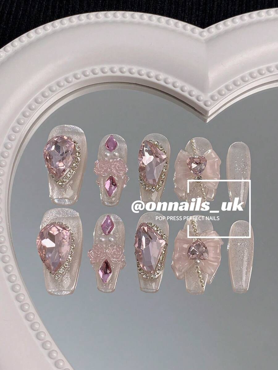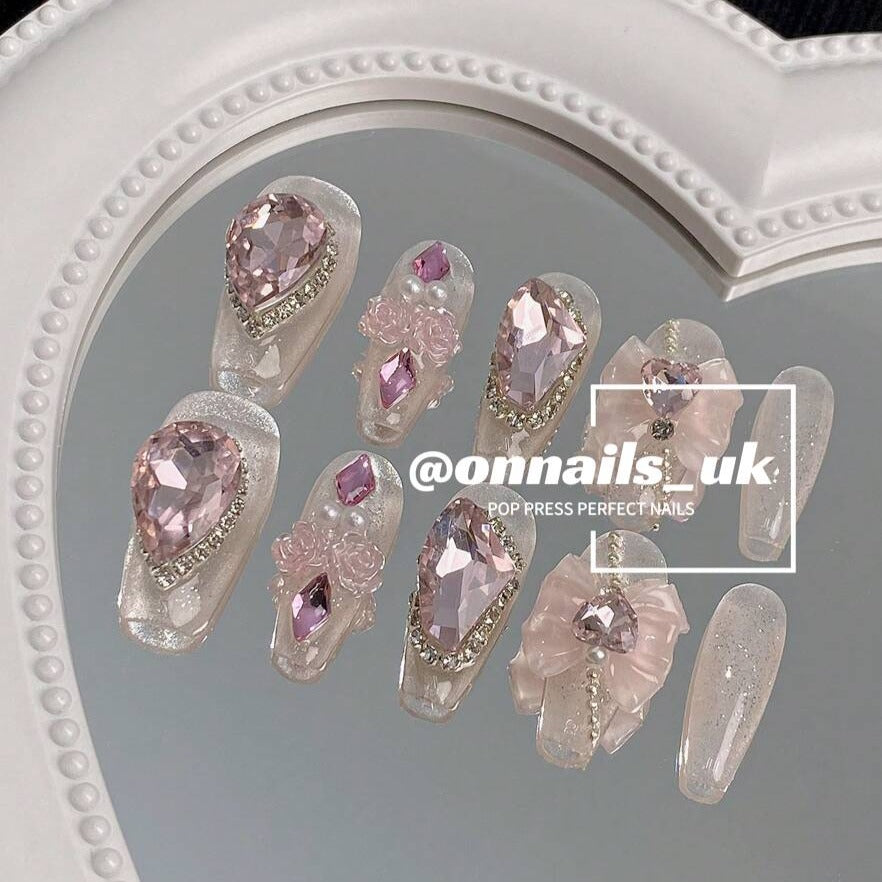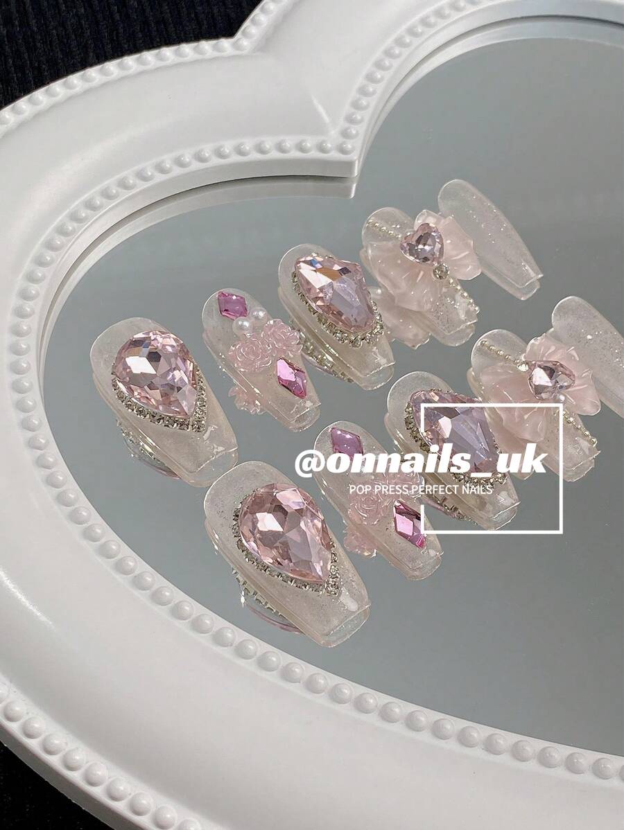 - Royal Embellishments: Each nail is adorned with large, sparkling pink rhinestones and delicate crystal accents, creating a lavish and eye-catching appearance.