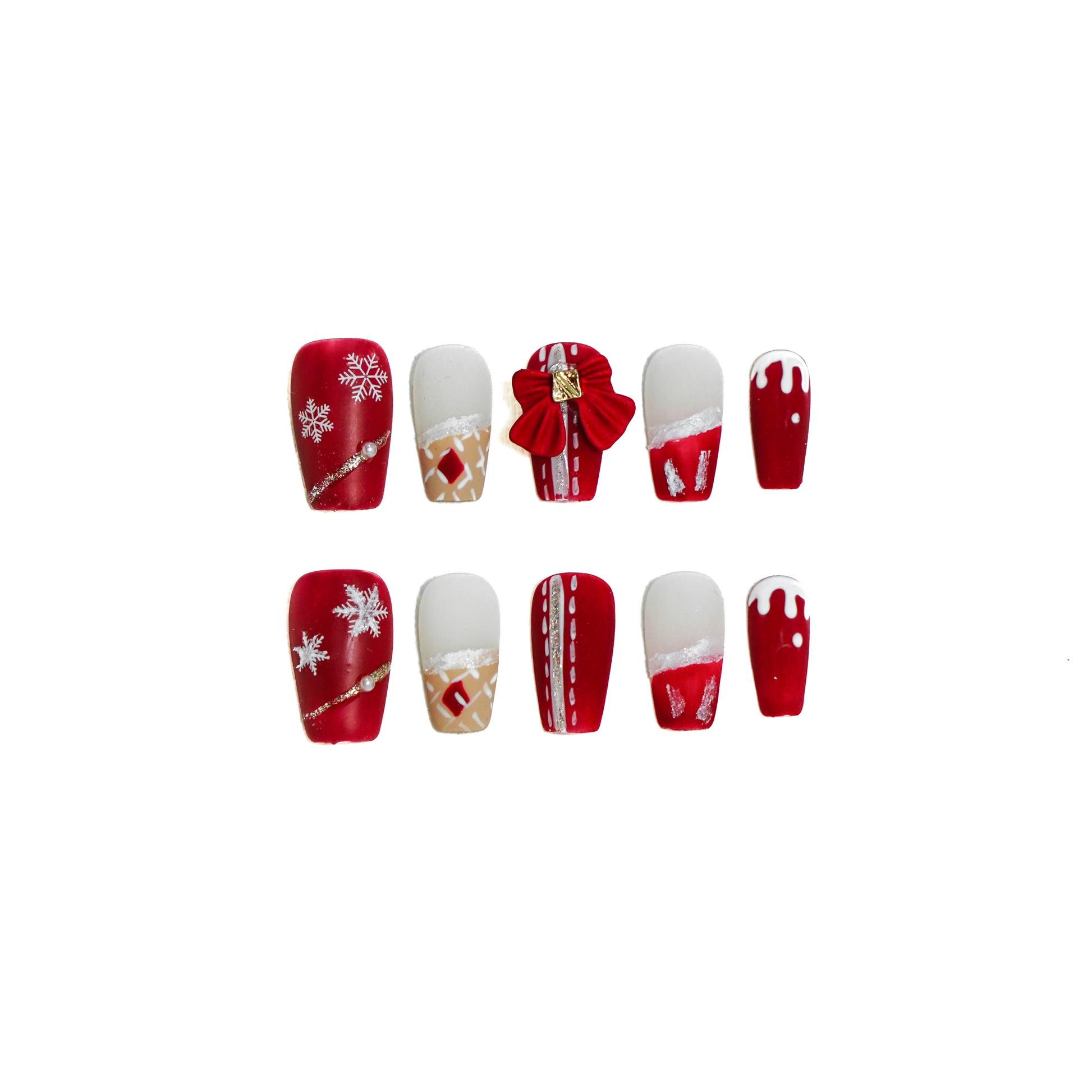 - Festive Accents: Each nail is adorned with holiday-inspired designs, including snowflakes, bows, and ornaments, capturing the joyful spirit of Christmas.