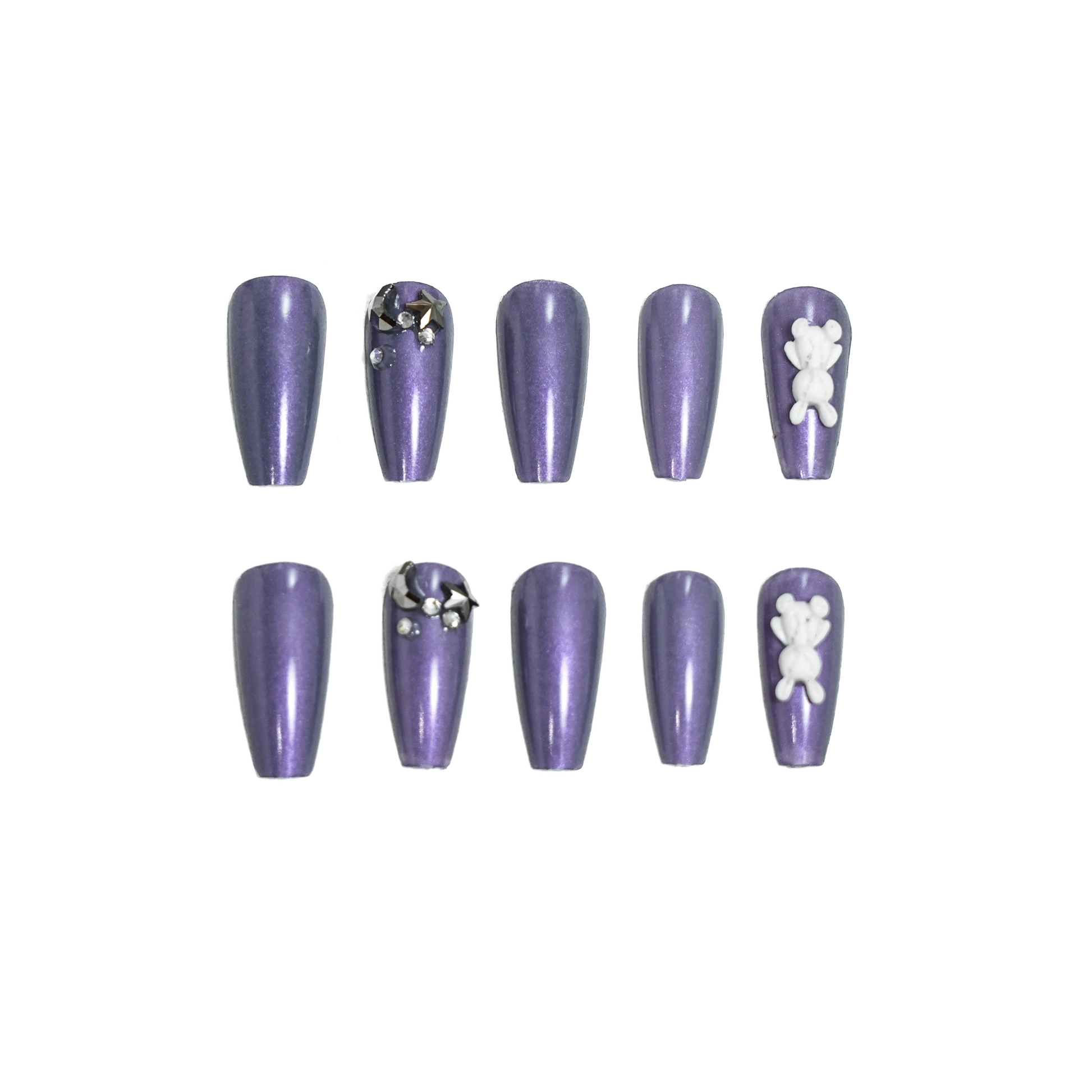 - Charming Embellishments: The nails are adorned with delicate white bear charms and sparkling rhinestones, adding a playful and whimsical touch to the elegant base color.